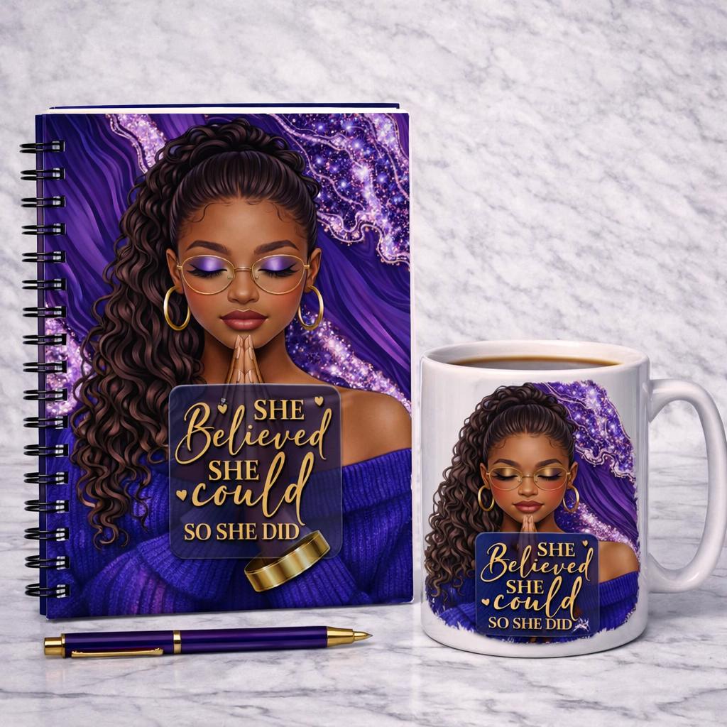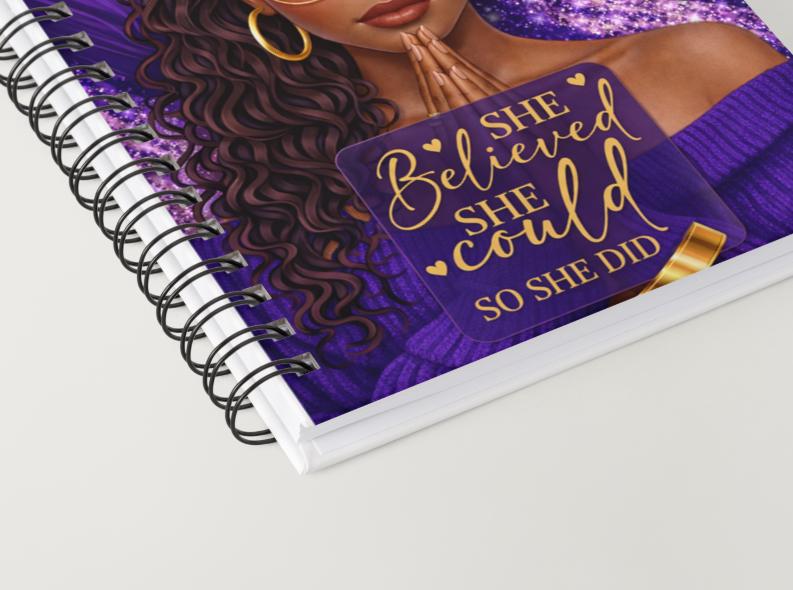 The “She Believed She Could, So She Did” journal features a powerful image of a Black woman in prayer, wrapped in rich purple and gold tones that symbolize faith, strength, and purpose. This journal was created for women who are walking by faith, healing, starting over, or stepping boldly into what God has promised.